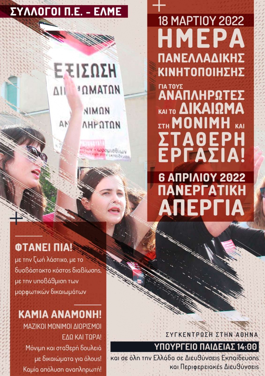 Η αγανάκτηση και η κούραση που έχει συσσωρευτεί σε όλους από τη διαρκή περιπλάνηση όλων αυτών των χρόνων, τις δυσκολίες και την ανασφάλεια για τη δουλειά και τη ζωή μας, πρέπει τώρα να μετατραπούν σε ένα δυνατό «φτάνει πια!», να γίνουν δυνατή φωνή διεκδίκησης. Με τους αγώνες και τις απεργιακές μας κινητοποιήσεις επιβάλαμε τα προηγούμενα χρόνια τους μόνιμους διορισμούς σε γενική και ειδική αγωγή, κατακτήσαμε τους 3,5 μήνες άδεια ανατροφής και άλλες άδειες, όπως για τις μακροχρόνιες ασθένειες, επιβάλαμε τη συμμετοχή των αναπληρωτών στα σωματεία.