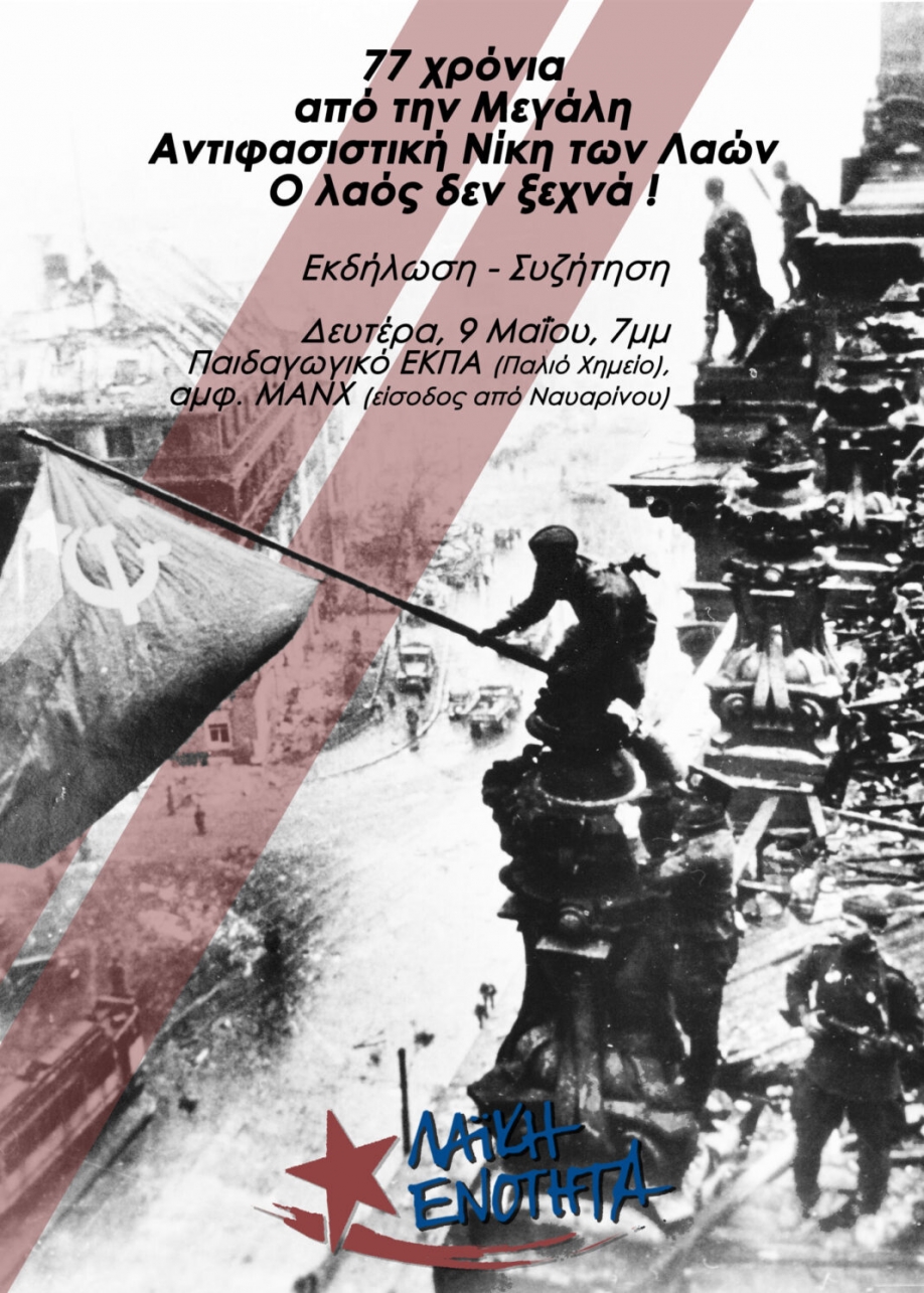 Η Λαϊκή Ενότητα,με αφορμή την 77η επέτειο από την Μεγάλη Αντιφασιστική Νίκη των Λαών ενάντια στον φασισμό και το ναζισμό,διοργανώνει εκδήλωση - συζήτηση που θα πραγματοποιηθεί τη Δευτέρα 9 Μαΐου 2022,ανήμερα της επετείου,στις 7.00' μ.μ. στο Παιδαγωγικό του ΕΚΠΑ (παλιό Χημείο),στο αμφιθέατρο ΜΑΝΧ (είσοδος από Ναυαρίνου).