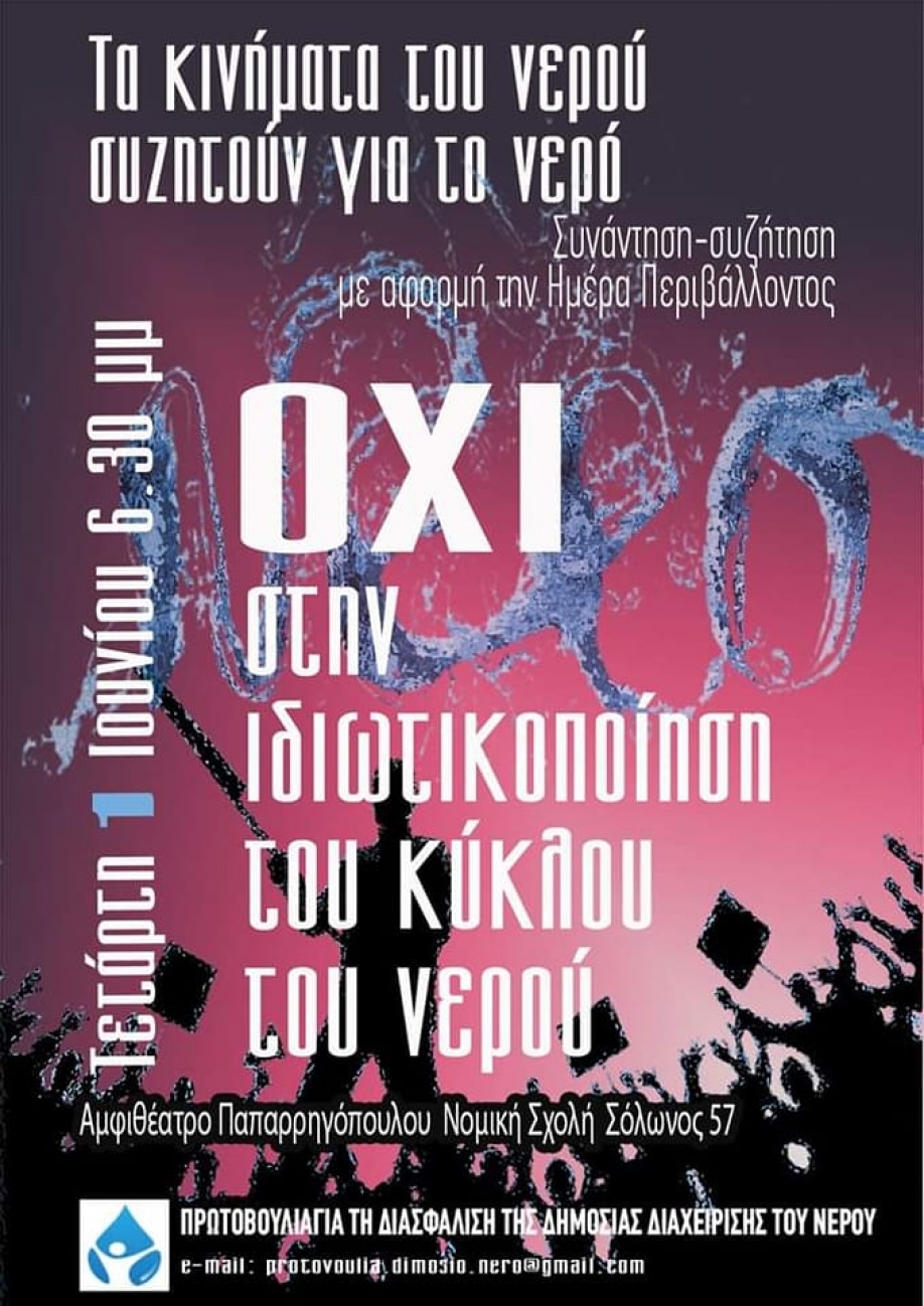 Συνάντηση συλλογικοτήτων για την αποτροπή της ιδιωτικοποίησης του κύκλου του νερού - Τετάρτη 1 Ιουνίου 6.30 μ.μ. στο Αμφιθέατρο Παπαρρηγόπουλου, Νομική Σχολή